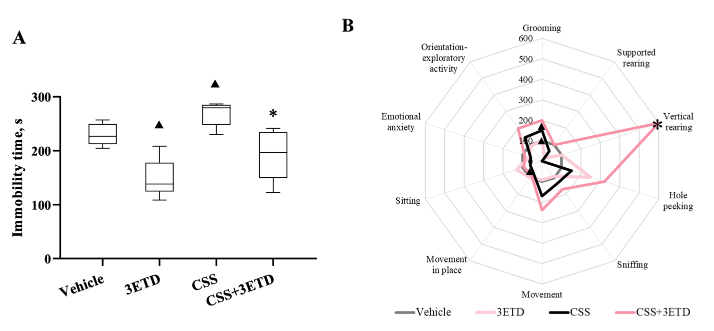 Figure 2. Behavioral changes in intruders treated with 3-ethoxythietane-1,1-dioxide (3ETD) in the forced swimming test (A) and open field test (B). Note: CSS – chronic social stress; A shows group medians, interquartile range, minimum and maximum; B shows group medians expressed as percentages relative to the vehicle; * p<0.05 (Mann-Whitney test, pairwise comparison with the CSS group), ▲ p<0.05 (Mann-Whitney test, pairwise comparison with the vehicle).