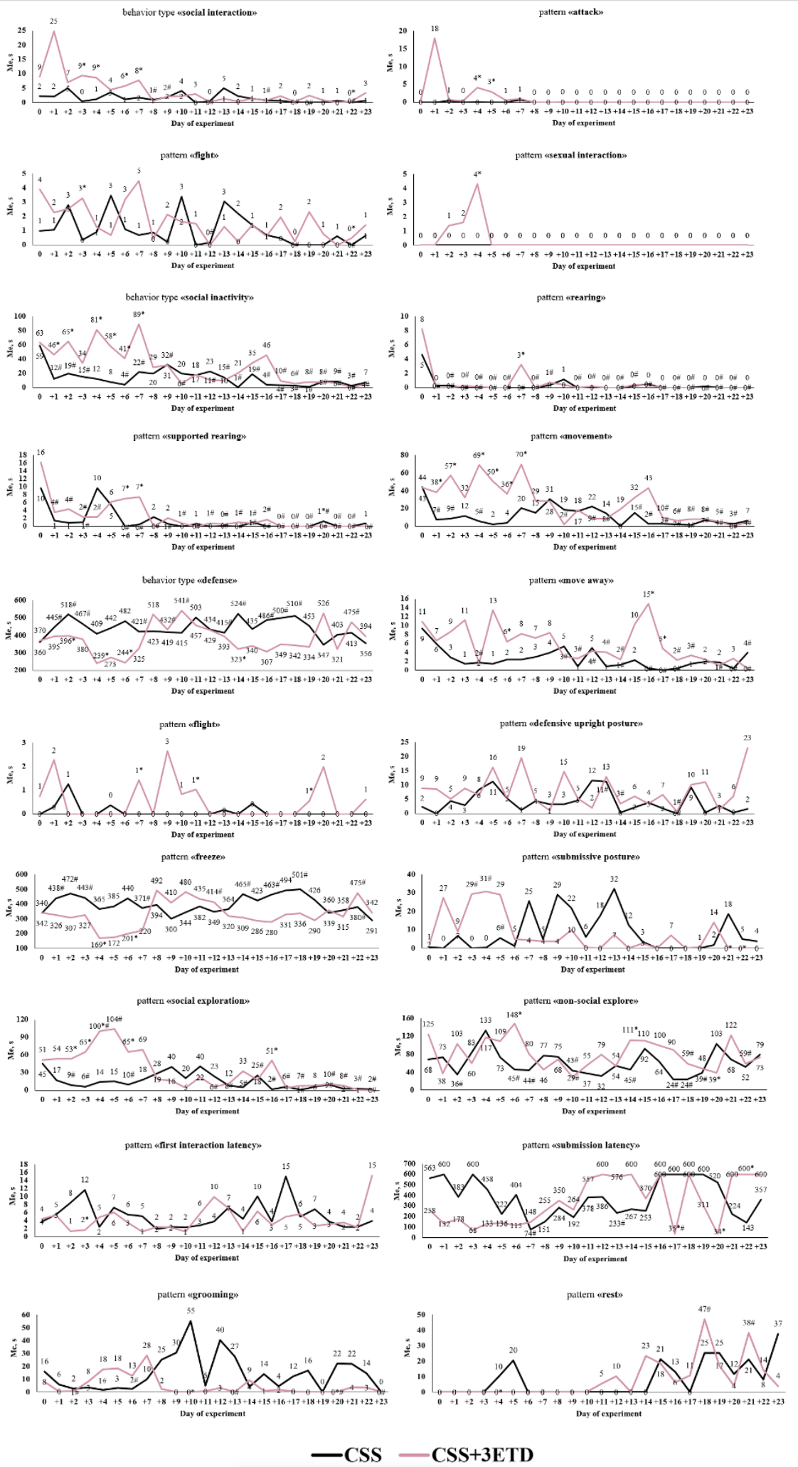 Figure 3. Behavioral changes in intruders treated with 3-ethoxythietane-1,1-dioxide (3ETD) during confrontations with residents. Note: CSS – chronic social stress; graphs show group medians; * p<0.05 (Mann-Whitney test, pairwise comparison with the CSS group), # p<0.05 (Wilcoxon test, pairwise comparison with Day 0).