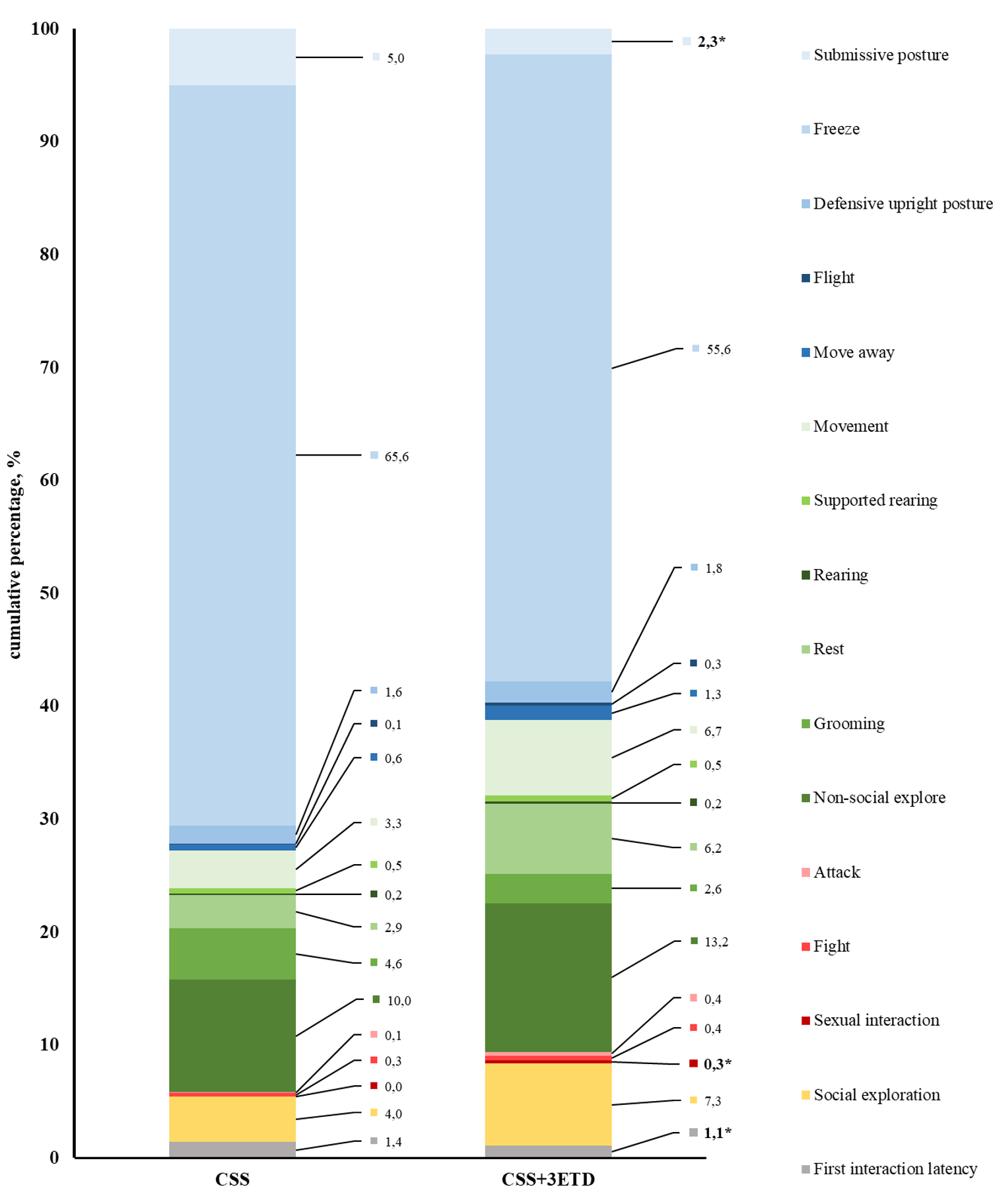 Figure 4. Changes in the behavioral structure of intruders treated with 3-ethoxythietane-1,1-dioxide (3ETD) during confrontations with residents. Note: CSS – chronic social stress; graphs show cumulative percentages of behavioral patterns (%), calculated using the formula: cumulative percentage = sum of shares of pattern / behavior type on each experimental day * 100 / 24; the “social interaction” behavior type is indicated in shades of red, the “social inactivity” behavior type is indicated in shades of green, and the “defense” behavior type is indicated in shades of blue; * p<0.05 (Mann-Whitney test, pairwise comparison with the CSS group).