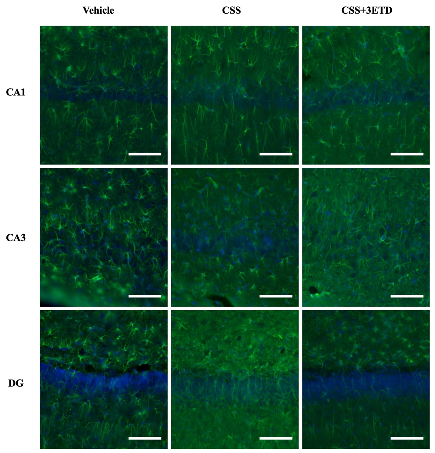 3ETD reduced the CSS-induced increase in astrocyte number by 12.5% in CA1 and DG, by 33.3% in CA3 (p<0.001) compared to the CSS group, and in CA3 it was reduced to the vehicle level (p=0.886) (Fig. 5).