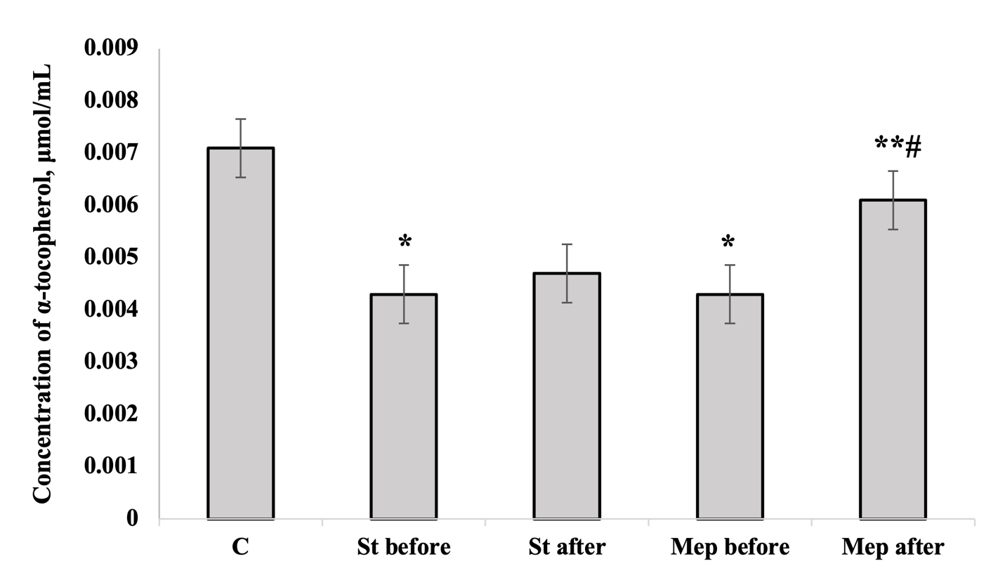 Figure 1. Serum α-tocopherol levels in participants of the control group (C), patients with chronic kidney disease treated with standard therapy (St before and St after), and patients treated with a combination therapy including methylethylpyridinol hydrochloride (Mep before and Mep after). Note: * – p<0.05 between pre-treatment and control group; ** – p<0.05 between post-treatment and pre-treatment data; # – p<0.05 between changes in parameters during combination therapy with methylethylpyridinol hydrochloride and changes in parameters during standard treatment.