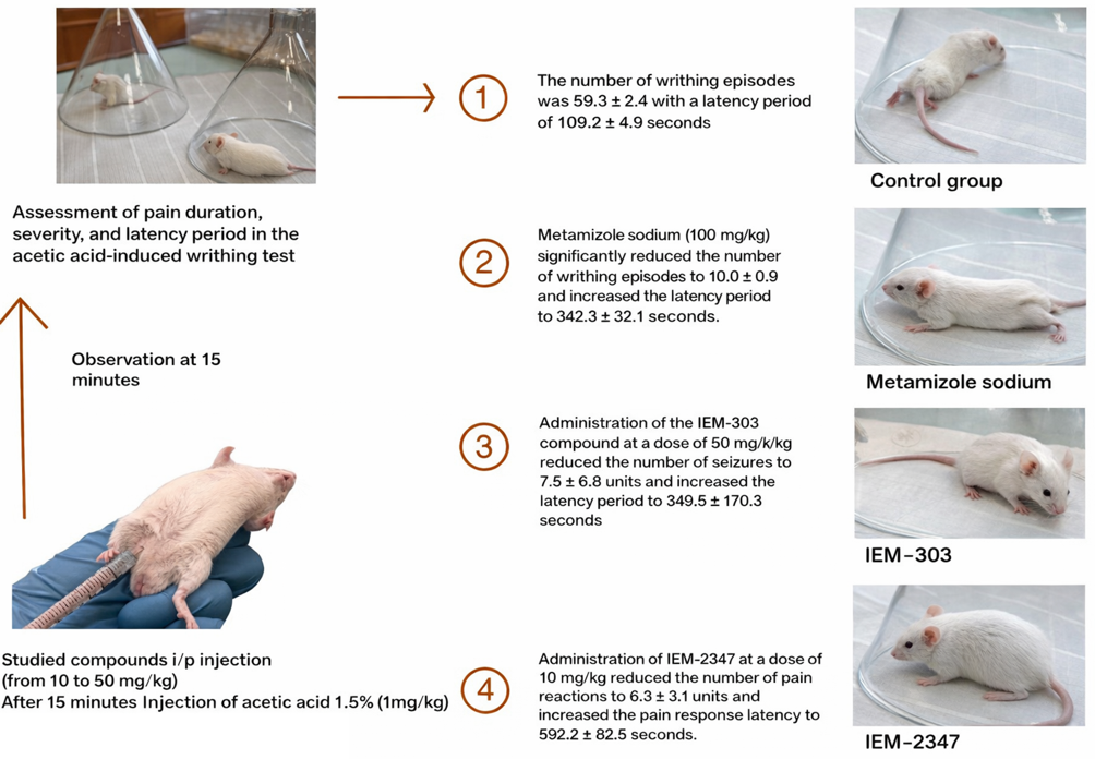 Materials and Methods: Intraperitoneal administration of algogen – 1.5% acetic acid solution –causes chemical pain irritation, manifested by specific animal movements called writhing. Fifteen minutes before the administration of 1.5% acetic acid solution, mice were intraperitoneally administered the experimental substances: IEM-303 at a dose of 50 mg/kg and IEM-2347 at doses of 10, 20, and 40 mg/kg. The control group of animals received a physiological solution in an equivalent volume, and the comparison group received metamizole sodium at a dose of 100 mg/kg. The analgesic effect was assessed by the ability of the drugs to reduce the number of writhings in comparison with the control group.