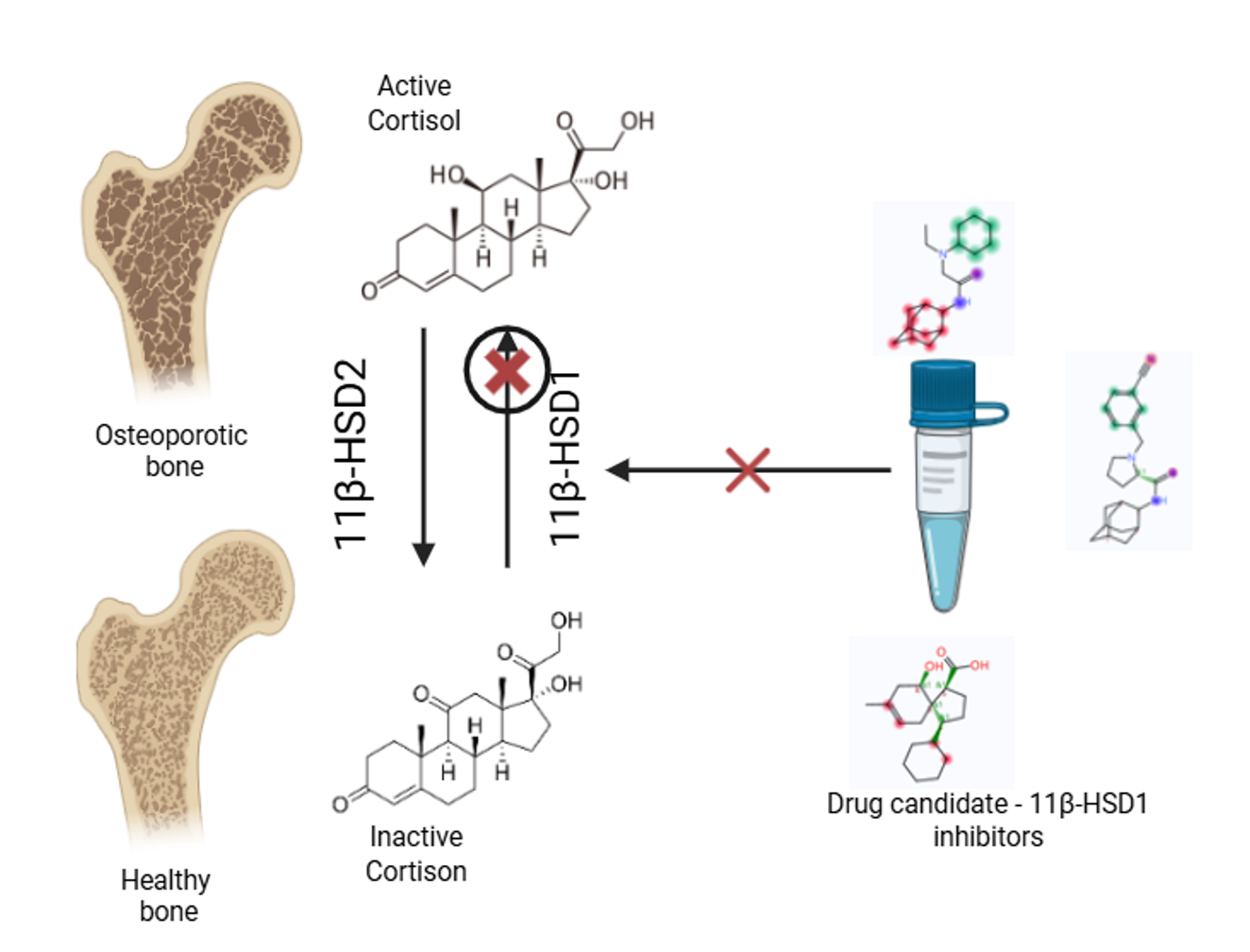 Results and Discussion: Current understanding of the molecular mechanisms of bone homeostasis allows for a significant shift and expansion in the paradigms for treating and preventing osteoporosis. 11β-hydroxysteroid dehydrogenase type 1 (11β-HSD1) is a key metabolic enzyme that catalyzes the intracellular conversion of inactive glucocorticoids into physiologically active ones. Research conducted over the past decade has shown that abnormal 11β-HSD1 activity contributes to the pathogenesis of obesity, type 2 diabetes, metabolic syndrome, and osteoporosis. The scientific challenge of regulating the activity of 11β-hydroxysteroid dehydrogenase (11β-HSD) isoforms and restoring homeostasis in the 11β-HSD1/11β-HSD2 enzymatic system is proposed to be addressed through the design and application of novel azole-based heterocyclic compounds as 11β-HSD1 inhibitors.